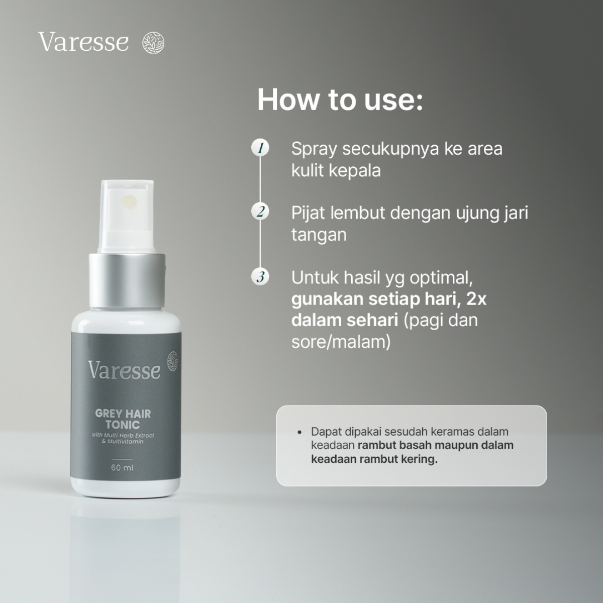 - Semprotkan Varesse Grey Hair Tonic secukupnya pada kulit kepala setelah keramas.