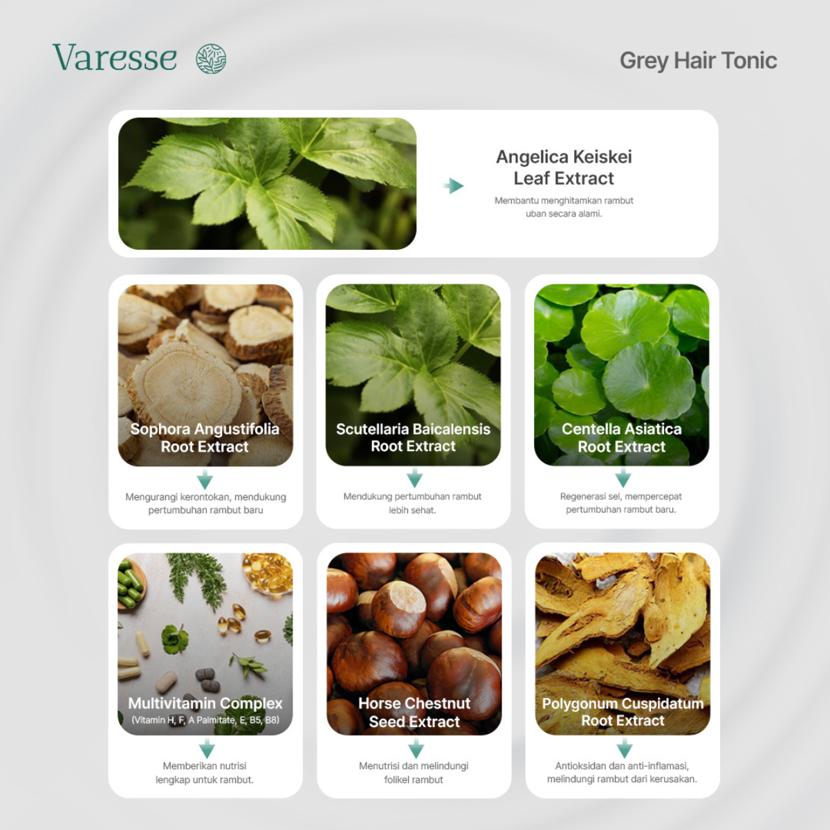 Varesse Grey Hair Tonic dengan bahan aktif Multi Herb Extract* dapat membantu menghitamkan uban, mengurangi rambut rontok dan mempercepat pertumbuhan rambut. Mengandung Multivitamin** untuk menutrisi rambut sehingga rambut tumbuh kuat & tetap sehat.